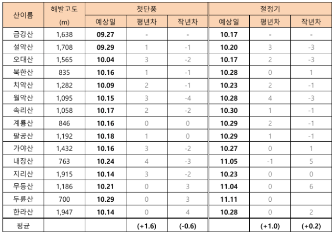 단풍 예보 메뉴에 들어가면, 전국의 주요 명산별 단풍 절정 시기 및 시작시기가 정리된 표가 나옵니다. 보통 이 표는 지역별로 구분되어 있으며, 산 이름과 첫단풍이 시작되는 시기와 단풍이 가장 아름다운 절정일이 나와 있습니다. 예를 들어, 설악산, 지리산, 북한산 등 단풍 명소들의 단풍이 드는 시기를 자세히 확인할 수 있습니다.
