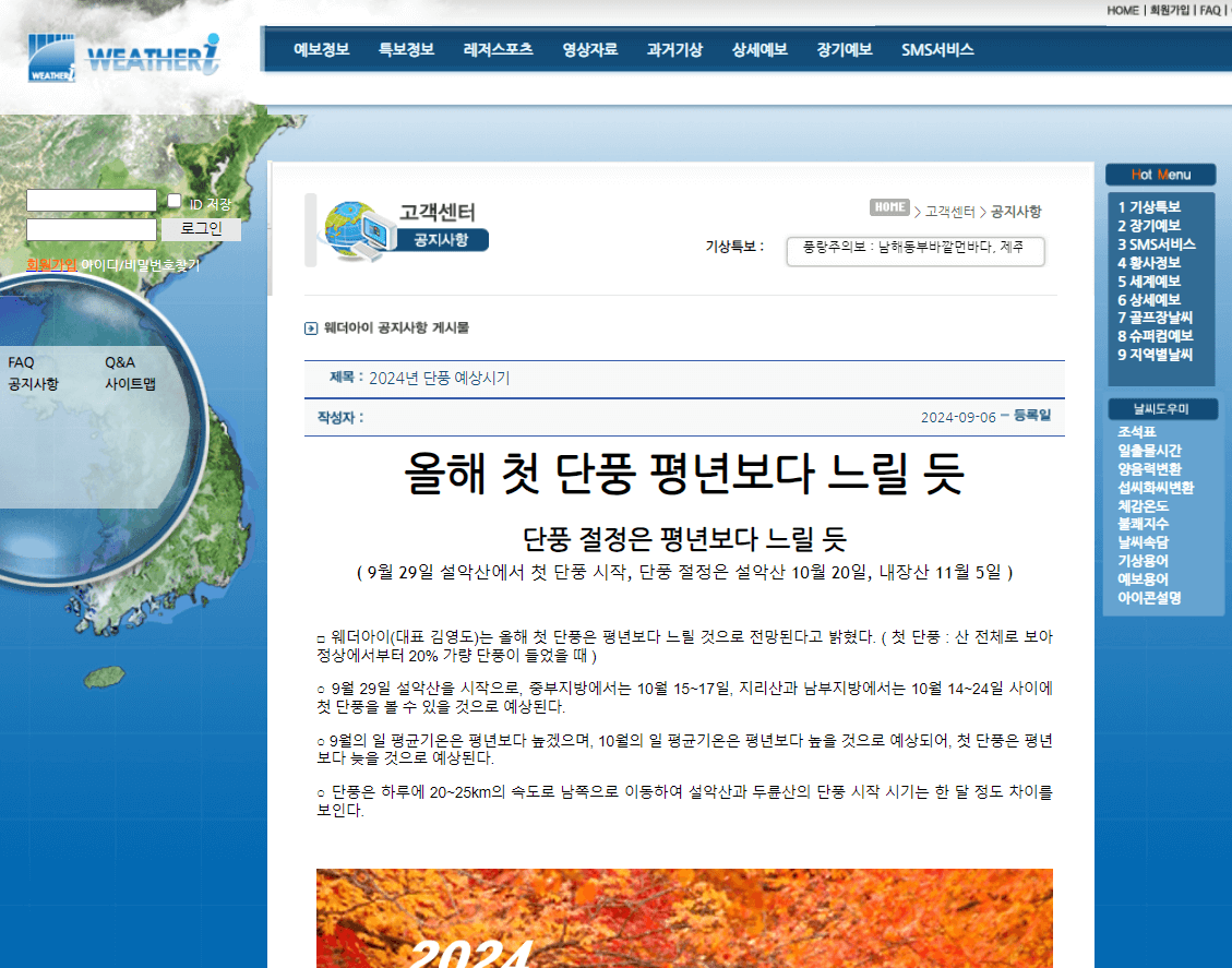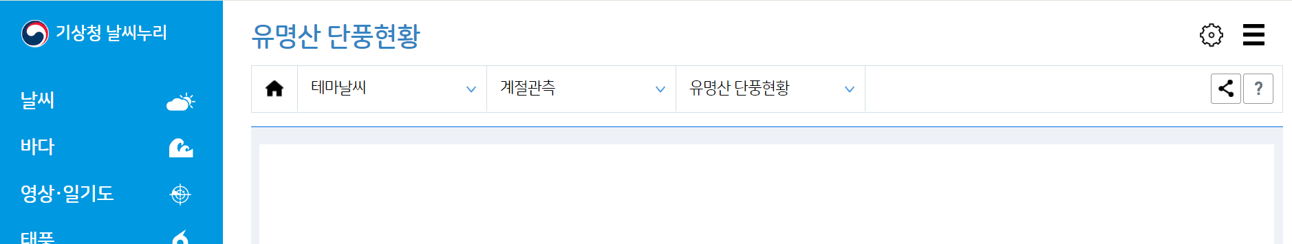 대한민국 기상정보를 전문으로 알수있는 사이트중에 하나인 웨더아이는 날씨와 다양한 기상자료와 여러가지 작업에 필요한 시즌별 날씨에 대해 알수있으며 단풍절정 시기를 예측하여 알려주는 사이트 입니다. 매년 업데이트로 여행을 가고자 하는 사람들에게 매우 유익한 정보입니다.