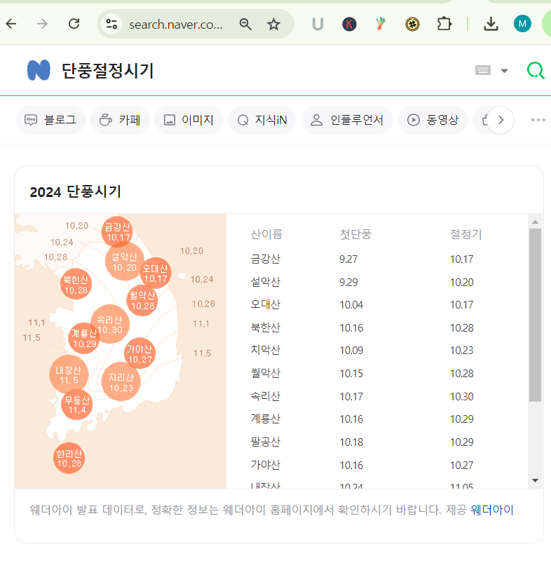 기상청에서는 단풍 예보와 관련된 자료를 주기적으로 업데이트합니다. 여기서도 설악산, 내장산, 북한산 등 한국의 주요 단풍 명소의 시기를 확인할 수 있습니다.