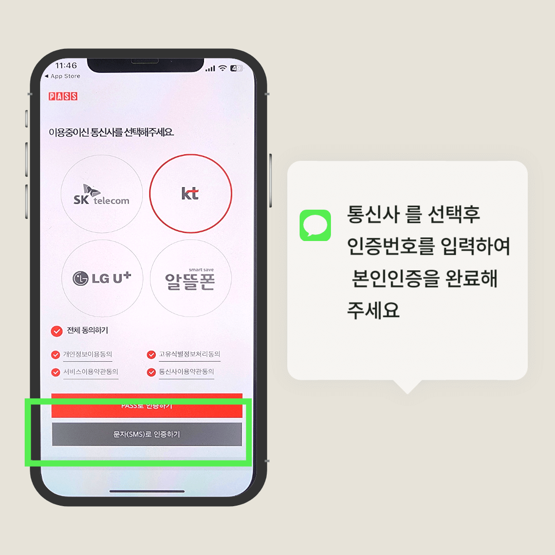 12) 통신사를 선택후 인증번호를 입력하여 본인인증을 완료해 주세요