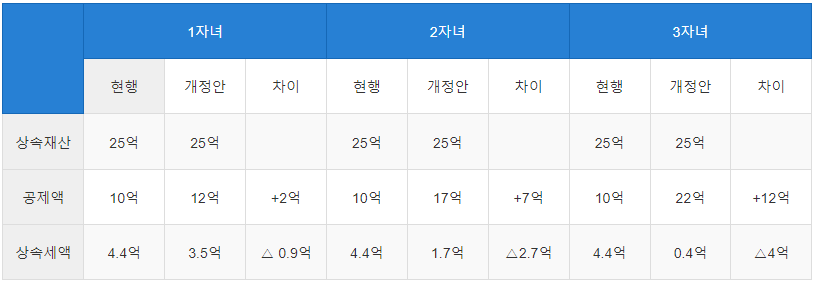 25억원 재산을 상속받는 상속인중에 배우자 1명 과 자녀 2명이 있는 사람이라면 현재 4.4억 원 대신에 개정안에서는