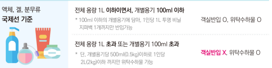 또한 객실반입의 경우는 액체분무 겔로 규정에 의해서 용량에 따라 반입이 제한이 따릅니다. 기내에 액체를 가지고 가시고자 하면 내용물의 잔여량에 관계없이 개별 용기 용량기준 100ml 이하로 반입이 가능하며 투명한 지퍼백 (20 cmx20 cm)에 넣어 닫은 상태로 1인당 지퍼백 1개만 기내 소지가 가능합니다.